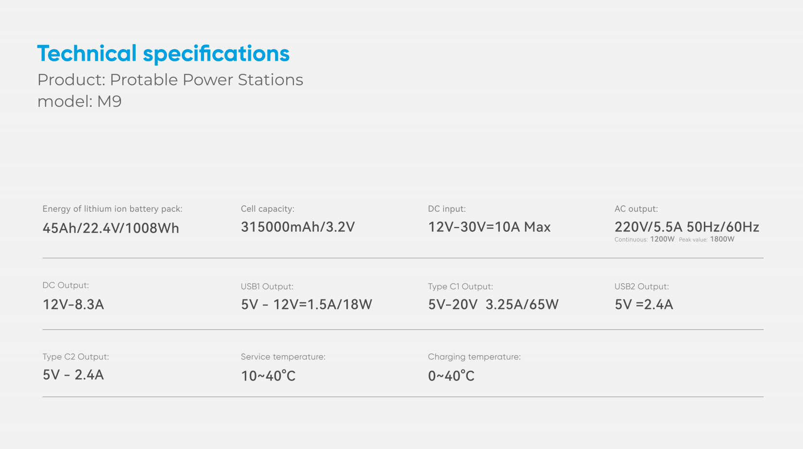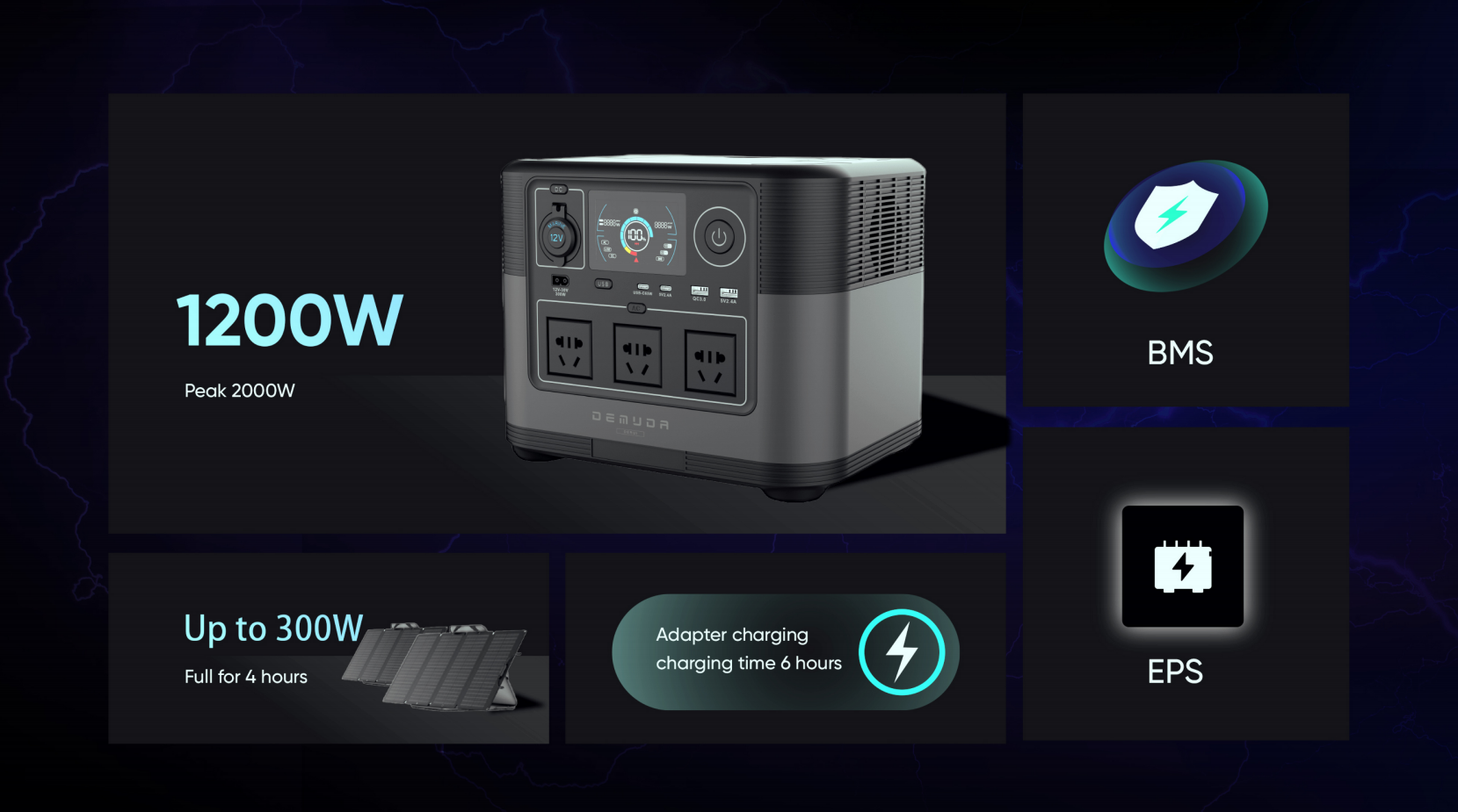 Rated power 1200W, battery capacity 1008WH; solar panel/AC input; 2000 cycles