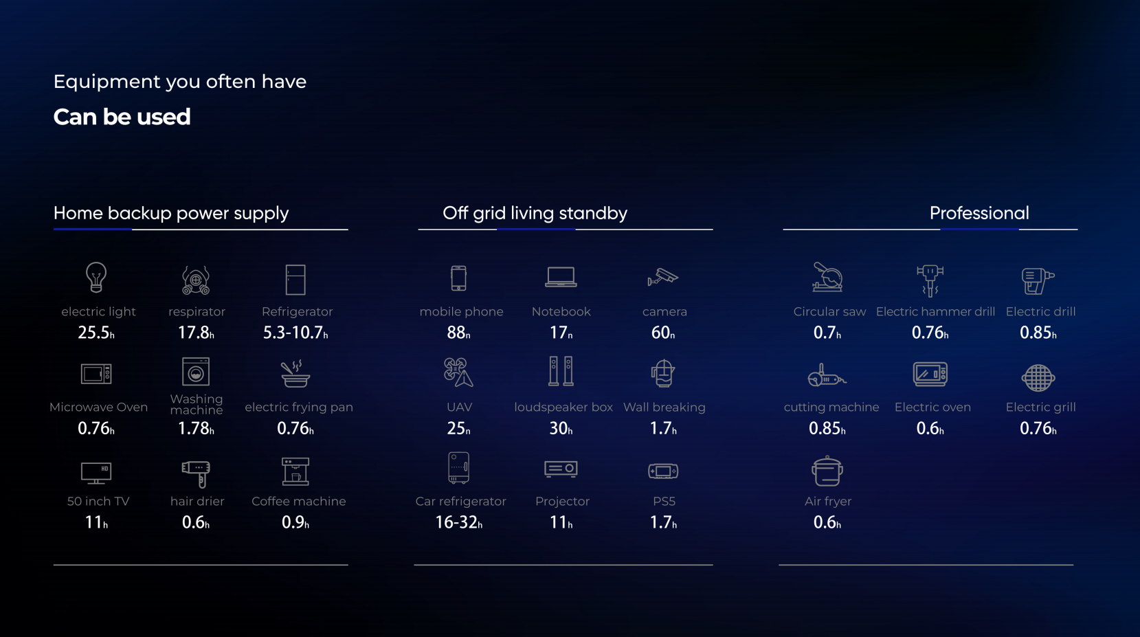 Battery capacity: 2496Wh, rated output power: 2500W, AC input voltage: 100V/120V/220V/230V/240V, battery life cycle: 4000 cycles, battery capacity > 70%, charging time: 2.5 hours (1400 input power), weight 25.5kg